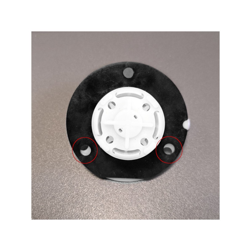Uwaga!! - Uszczelka jest uniwersalną uszczelką do odpowietrzników pasujący do wielu typów zbiornika i czasami może występować lekkie przesunięcie otworów na śruby (patrz przykładowe zdjęcie). W takim przypadku niezbędne jest przed montażem poszerzenie otworu w gumie.